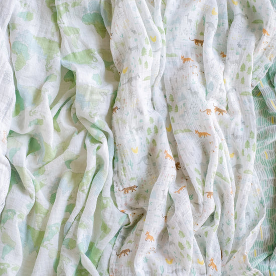 Each cotton muslin swaddle blanket measures 112 cm x 112 cm / 44" x 44"