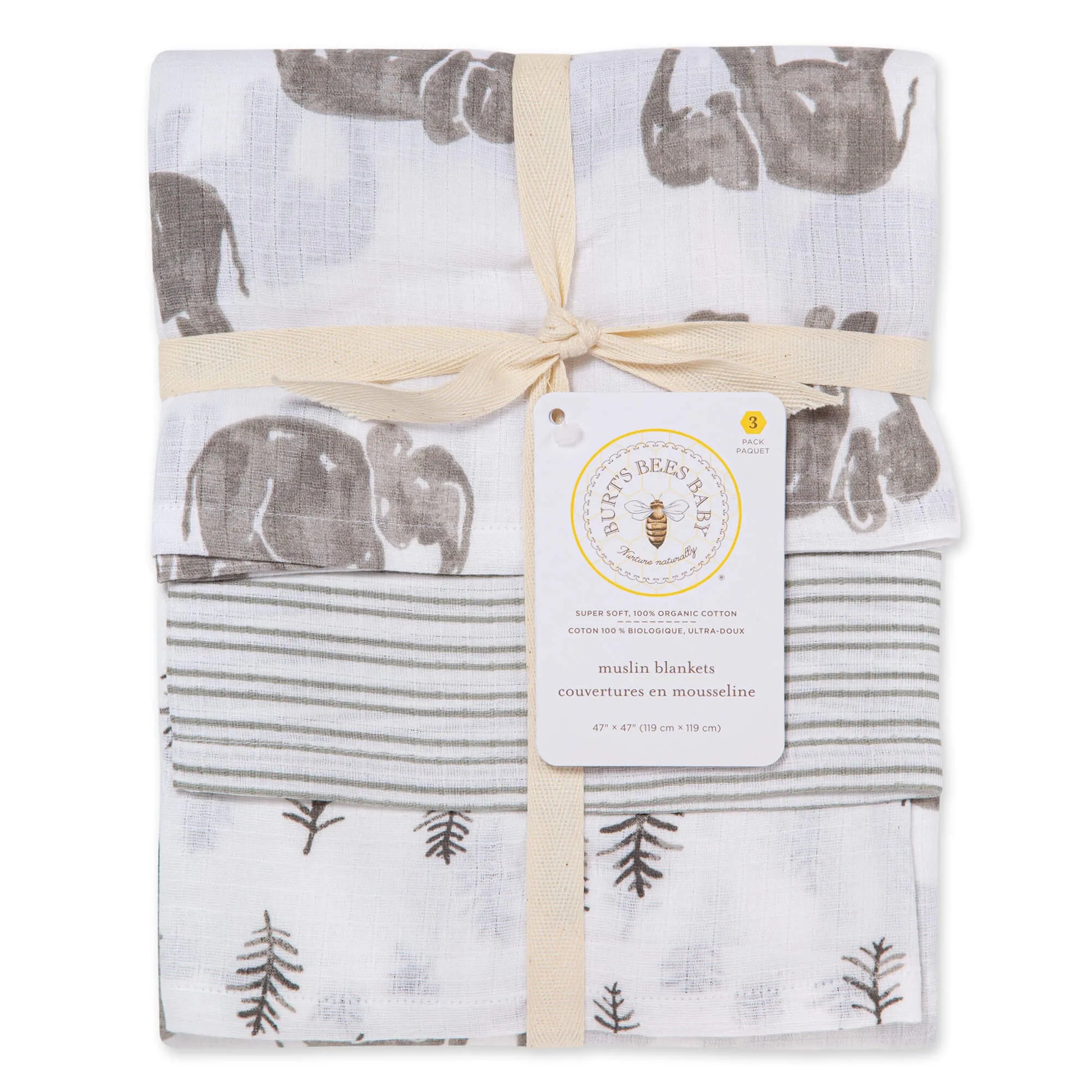 Burts Bees Baby Organic Baby 3-pack Muslin Swaddle Blankets (Wandering Elephants)